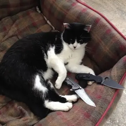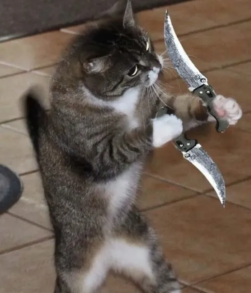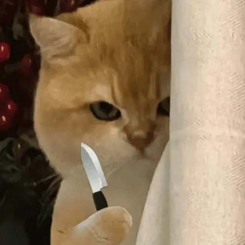 Meme mèo tay cầm dao là dạng ảnh hài lấy khoảnh khắc chú mèo đang nắm một con dao bếp hay dao gọt, tạo nên cảm giác phản ứng dữ dằn nhưng lại đáng yêu vì lông dựng, bộ ria rung nhẹ và ánh mắt cảnh giác đầy sát khí. Đây là kiểu meme dùng để biểu đạt trạng thái nổi cáu, muốn cảnh cáo ai đó hoặc dùng khi bạn thấy ai làm điều sai trái mà bạn tức đến mức muốn cầm dao thủ thế như chú mèo.