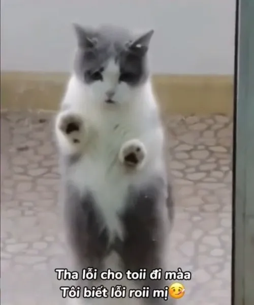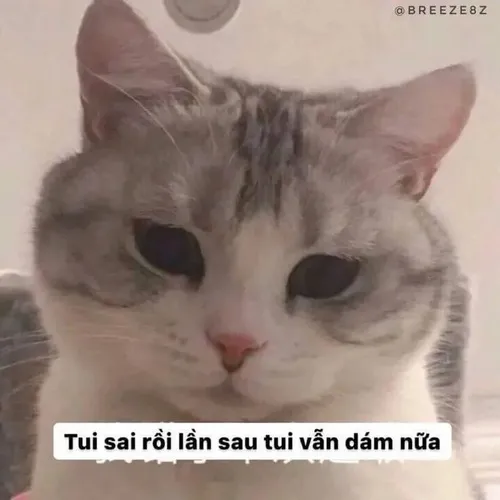 Meme mèo xin lỗi là những tấm ảnh bắt trọn khoảnh khắc bé mèo cúi mặt, nép vào một góc nhỏ hoặc chồm nhẹ như đang nhận lỗi. Sự đáng yêu nằm ở biểu cảm áy náy pha chút ngại, đôi mắt buồn buồn, ria thì rung nhẹ như muốn nói rằng nó biết mình vừa làm điều gì đó không ổn.